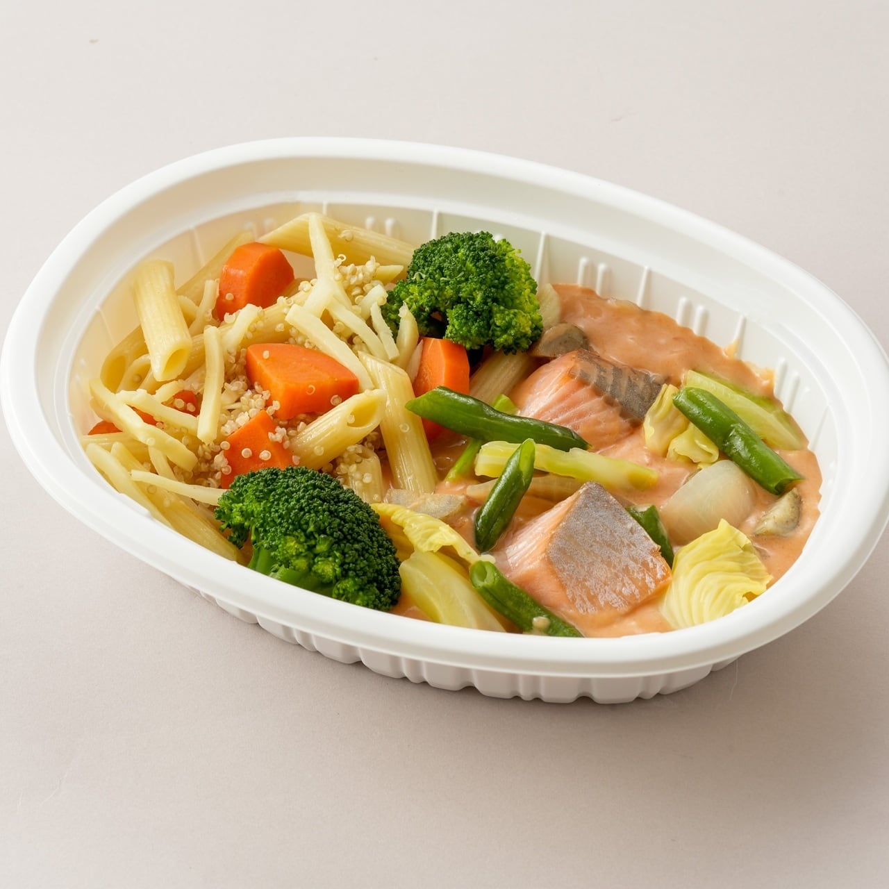 ●「噛む」サーモンと雑穀のショートパスタ-豆乳トマトソースソース-